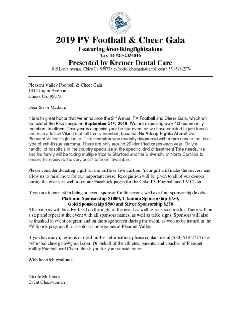 Challenger Division Fundraiser Golf Tournament Set For Sunday October 8 Temecula Valley Pop Warner Youth Football And Cheer. The benefit of being a sponsor address the letter to a specific person, if possible. Sponsors, in the form of individuals or companies, grant funds for an event or program. Sponsorship letters are written to potential people or organizations who are likely to provide funds for an event or some other activity. Doing the necessary research to identify the individual authorized to make sponsorship decisions. That's where sponsors come in. This letter can perfectly be written by keenly following the guidelines in the sponsorship request letter sample, failure to do this; It might lead to a poorly written letter or failing to mention. Support the athletes who support the athletes! Sponsorship letters are used by nonprofits looking to raise more money from local companies. Thank you so much for your consideration in supporting the shs cheerleaders! Sponsorship letters are written with proper understanding of business writing and letter drafting. 12 free templates for writing a sponsorship proposal. Use these samples to write your own sponsorship letter! The basic aim is to convey to the sponsor(s) how their contribution will prove beneficial, not only for you, but to them as well. Use our effective sponsorship letter examples.
