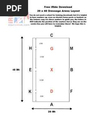 Iride Free Download 40 X 20 Dressage Arena Layout. Here are are a few sayings to help memorise the order of dressage letters the arena. There are two sizes for dressage arenas, with the first small dressage arena being a 20 meters x 40 meters arena and the second 60 meters x 20 meters arena (or 20 by 60). Arena sizes can vary according to the competition and who is organizing. Top brands to outfit your horses, your stable, and yourself Learn how to set up dressage letters for. A standard dressage arena is 20 metres by 40 metres and 8 letters are used around the edge of the arena. A long dressage arena is 20 metres by 60 metres and 12 letters are used around the edge of the arena. The images below show the location of letters placed around 20m x 40m dressage arena and 20m x 60m dressage arena. The letters in black show the perimeter marking. The 20×60 metre dressage arena markings are shown on the right. There will always be physical markers around the perimeter of the arena. But there are never any visible. The letters in red show the lettering down the centre line. The 20×40 metre dressage arena markings are shown on the left. Read customer reviews & find best sellers.