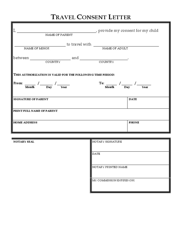 11 Notarized Letter Template For Child Travel Proposal Letter. Essentially, you write a letter of consent to give someone permission to do something or use something that belongs to you. Our website's sample consent forms and informed consent forms are downloadable and printable for use when such forms are needed to gain travel permissions for a child or minor traveler. Child travel medical consent letter form in pdf. In the case of international travel, the child should be holding a valid passport and the passport number should be included in the letter of consent. You can modify it and reuse it. Treat the letter seriously, typing it in business letter format and signing it in ink in the presence of a notary public. This article is about sample letter of consent to travel without parents, parental consent letter sample, recommended consent letter for children your letter should be written in a business formal format. A travel consent letter is used when a child is travelling alone, with only one parent/legal guardian, or with an authorized group. If you happen to be looking for more examples of consent letters, feel free to check out our child travel consent forms, to have an idea on how to go about granting your child permission to be accompanied by a designated reliable guardian. Letters of consent are used in many contexts. Letter of consent for travel of a minor child. Start it by writing sender's name and address, write the date and after required space. At the end, you receive it in word and pdf formats. The document is created before your eyes as you respond to the questions. Consent letter for minor children traveling format.
